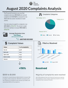 September 7th, 2020, The Financial Commission announces its operating metrics for the month of August 2020 as part of its monthly Complaints Digest. The organization recorded an anticipated decrease in new filed complaints due to the traditional summer slowdown while experiencing growth in several key metrics and achieving record performance by posting the fastest overall dispute resolution times in the organization’s Dispute Resolution Committee (DRC).
