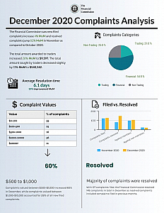 Global impacts from Covid-19 continued to impact market volatility as investors looked to have embraced equity and shares Contracts for Difference (CFD) trading more so than traditional Forex. Continued interest in trading has supported the demand for dispute resolution services, as highlighted by several key metrics of the Financial Commission, including new complaints filed and total complaints resolved, average complaints values, and non-member compensation sought. While financial-related complaints continued to dominate, non-trading complaints jumped 39%, suggesting investors are having issues outside of traditional trading and funding or withdrawals. At the same time, the Dispute Resolution Committee (DRC) was able to rule a significantly higher number of complaints in favor of traders in December, as cases ruled in favor of clients jumped 100% month-over-month.