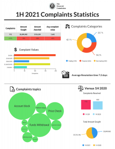 - Traders were awarded less compensation in the first half of 2021 as compared to the same period last year due to several key outliers in 2020 and indicating the large proportion of complaints ruled in favour of brokers