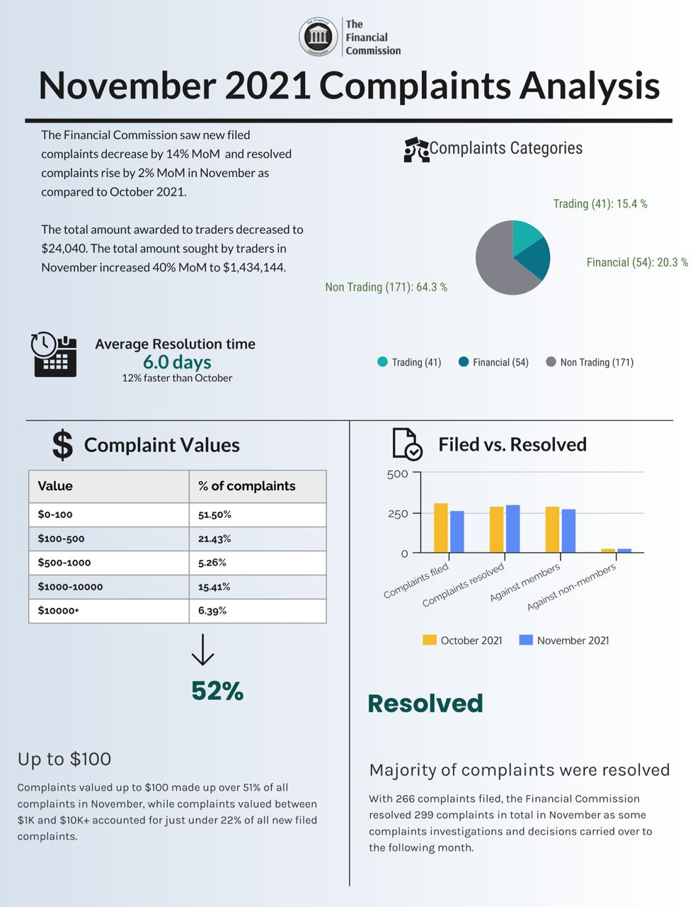 Demand for retail trading continues to impact several key metrics of the Financial Commission for November 2021. Relatively lower numbers for newly filed complaints and increases in resolved complaints suggest traders are continuing to try and take advantage of market opportunities with the Dispute Resolution Committee (DRC) continuing to process a significant amount of complaints in the last quarter of the year. The DRC was able to award a smaller amount of compensation to traders than in the previous month while experiencing a jump in the amounts sought by traders from broker members in November. At the same time, over 22% of all new complaints filed with the DRC in November were valued between $1,000-$10K+, highlighting the continued importance of the organization to investigate complaints with a significant monetary value. During the month, the DRC was able to resolve 2% more complaints than in October with some complaint investigations and decisions carrying over into November, while improving average resolution times, which still continue to outpace alternative EDR services.