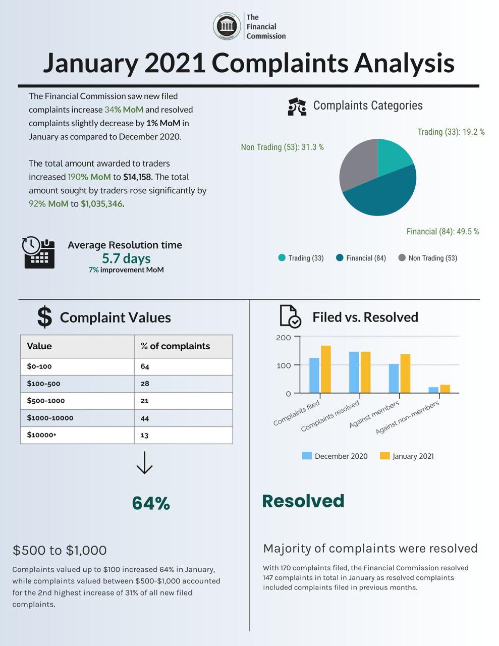 15 февраля 2021 г. Финансовая комиссия объявляет о продолжающемся ежемесячном росте числа поданных жалоб, а также компенсаций, запрошенных и присужденных трейдерам за январь 2021 г. в рамках своего ежемесячного дайджеста жалоб. Организация зафиксировала значительный рост числа запрошенных компенсаций, процента присужденных компенсаций, жалоб, решенных в пользу трейдеров, и ряда других ключевых показателей, достигнув при этом среднего времени разрешения споров всего в 5.7 дня.