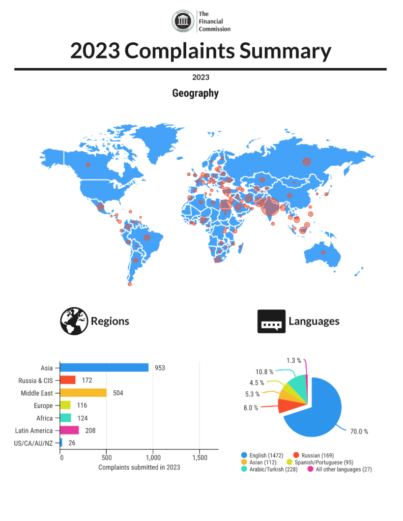 Большинство жалоб в 2023 году были связаны с финансовыми вопросами — 49% от общего числа, в то время как споры, связанные с торговлей, составили 23%, а жалобы, не связанные с торговлей, — 29%. Наиболее популярными темами жалоб были вывод средств (41%), блокировка счета (24%), проверка цен (11%), проблемы с платформой (5%) и ордера stop out (3%). Из всех решенных жалоб 32% были решены «в пользу брокера», 12% были решены «в пользу клиента», а 56% оказались вне юрисдикции организации. Доля жалоб, решенных в пользу трейдеров, на 30% выше, чем в предыдущем году.