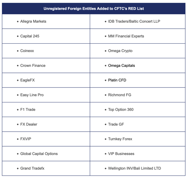 The regulator indicated that a firm is added to the RED List when the CFTC determines, from investigative leads and questions from the public, that it (i) is not registered with the Commission and (ii) appears to be acting in a capacity that requires registration, such as trading binary options, foreign currency (forex), or other products. The Commodity Exchange Act generally requires intermediaries in the derivatives industry to register with the CFTC.