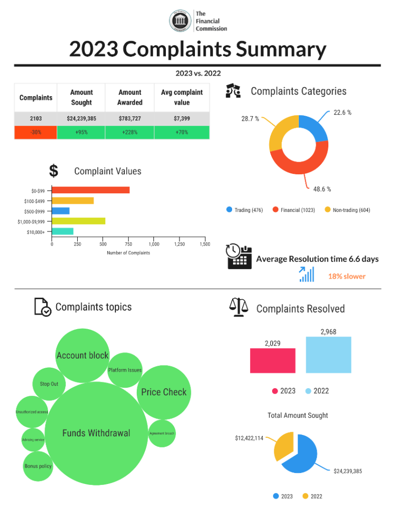 Большинство жалоб в 2023 году были связаны с финансовыми вопросами — 49% от общего числа, в то время как споры, связанные с торговлей, составили 23%, а жалобы, не связанные с торговлей, — 29%. Наиболее популярными темами жалоб были вывод средств (41%), блокировка счета (24%), проверка цен (11%), проблемы с платформой (5%) и ордера stop out (3%). Из всех решенных жалоб 32% были решены «в пользу брокера», 12% были решены «в пользу клиента», а 56% оказались вне юрисдикции организации. Доля жалоб, решенных в пользу трейдеров, на 30% выше, чем в предыдущем году.